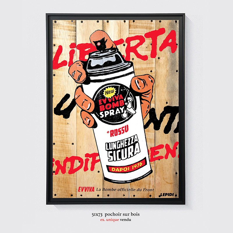 Oeuvre originale « E V V I V A » - exemplaire unique. Pochoir Acrylique sur bois. - Cette réalisation est montée sur un encadrement de type "caisse américaine". Mars 2026. (VENDU)